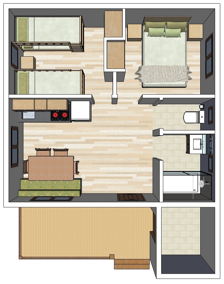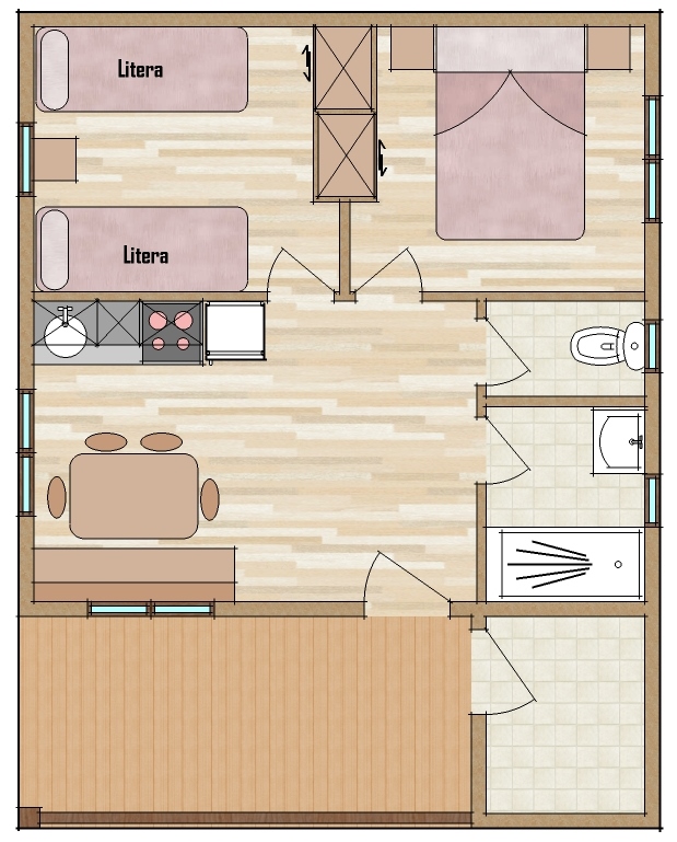 Bungalow ideal para la montaña, dos habitaciones con capacidad de alojar a 6 personas, dispone de un trastero que permite guardar los equipos de deportes de invierno sin tener acceso al interior del espacio de vida, que brinda mas comodidad y practicidad. Cuenta con doble aislamiento y toda la calidez que brinda la madera.